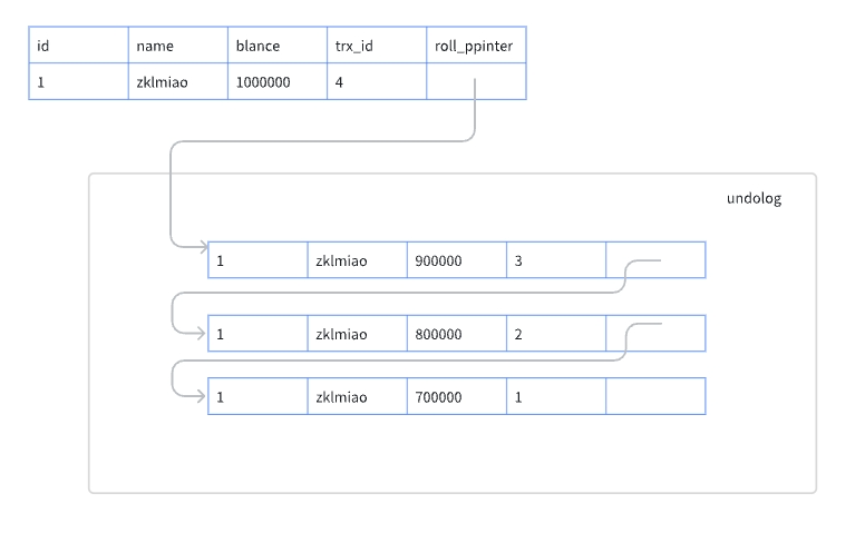 4.同上在undolog中沿版本链找到第一个比当前trx_id=6 小的行记录trx_id=3,读取数据返回[1,zklmiao,900000,trx_id=3]。########## ----> 此时 trx_id = 4 提交事务